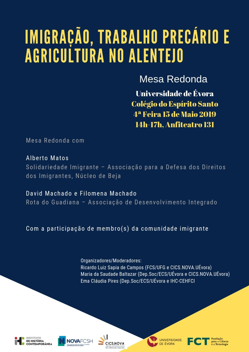 Este evento, organizado pelo CICS.NOVA.UÉvora e o IHC-CEHFCi, aborda a problemática do trabalho precário eou “negro” no Alentejo principalmente na pujante agricultura extensiva e intensiva, particularmente nas: “apanhas da azeitona” e nos trabalhos de estufa, mas não só. Portugal cada vez mais se conecta com os problemas acerca dos imigrantes que ocupam postos de trabalho precários ou de baixa qualificação. A comunidade académica, entre outras entidades públicas e privadas, tem o compromisso institucional de tratar do tema que impacta o território.